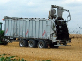 Gigantický príves s vytláčacím systémom kombinovaný s vysokovýkonným rozmetacím zariadením.