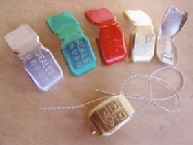 Plomby z hliníku. Aplikácia vsunutím plombovacieho drôtiku a následným zaklapnutím plomby bez použitia klieštikov.