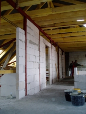 Vytýčenie stavby, označenie výkopov, samotné výkopy ako I celkové založenie stavby (šalovanie, debnenie, základové dosky), následne murovanie, preklady, vence, schody.