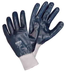 Rukavice bavlnené s pružným nápletem, celomáčané v modrom nitrile, dĺžka 25cm, vel. 06,07,08.