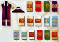 Dĺžka 250 cm. Materiály: 100% polyester, liturgický brokát, zlatý, alebo strieborný lurex. Bežná jednofarebná, dvojfarebná: biela/fialová, červená/zelená.