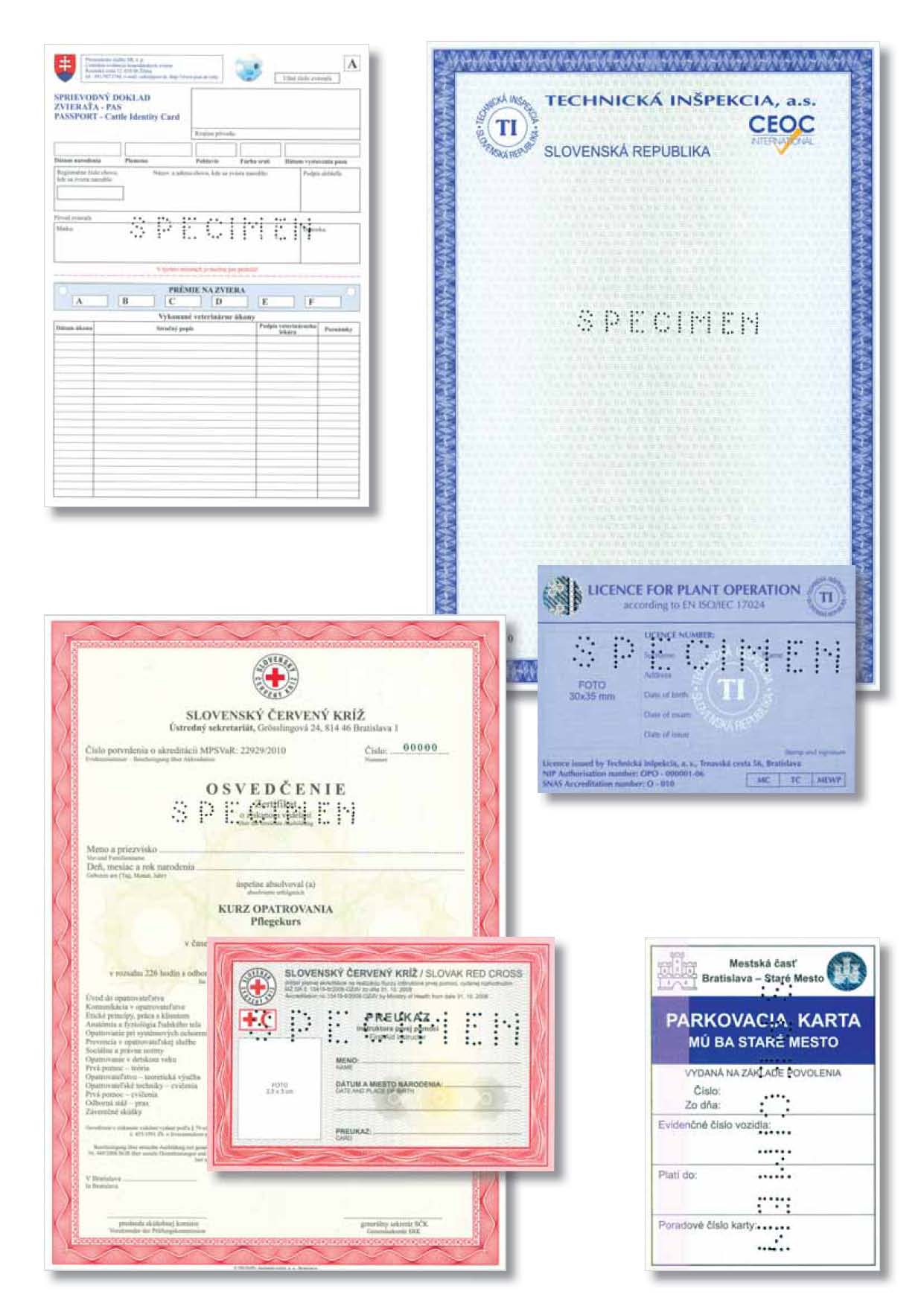 Čistopisy certifikátov, licencií a povolení, ktoré objednávajú orgány štátnej správy, ministerstvá, rôzne združenia a zväzy, oprávňujú ich držiteľov k určitým činnostiam, alebo k dovozom a vývozom niektorých špeciálnych komodít. Diplomy a certifikáty o ukončení štúdia pre vysoké školy tiež patria do kategórie špeciálne zabezpečených tlačovín. Tomu musí zodpovedať aj stupeň ochrany týchto tlačovín. Pri ich tvorbe využívame väčšinu ochranných prvkov ako pri cenných papieroch v listinnej podobe.