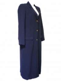 Dámsky kabát, tmavo-modrej farby, dlhý po kotníky, vpredu 2 vrecká, zapínanie na 3 zlaté gombíky, na rukávoch ozdobné 2 gombíky, 100% polyester.