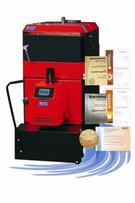 Kotol na spaľovanie drevných peliet s regulovaným výkonom 8 - 30kW, automatické čistenie rúrového výmenníka kotla v intervaloch zhodných s automatickým odvodom popola do výnosného kontajnera, automatické čistenie horáka.