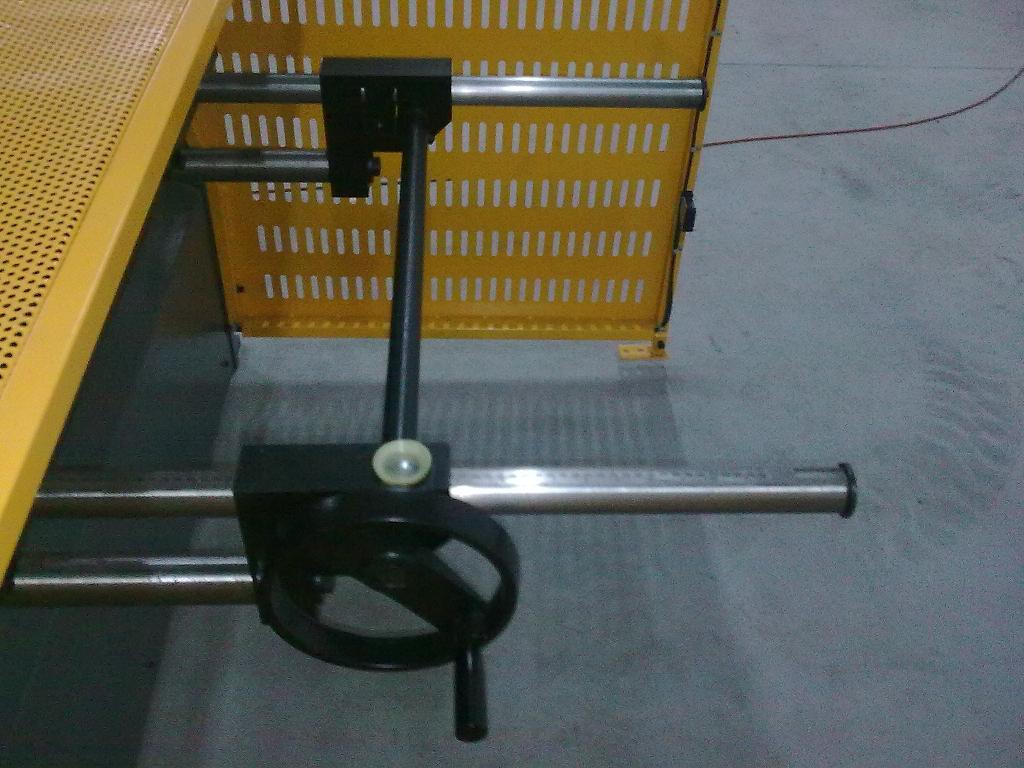 Manualne zadného dorazu. 1.5m predné zauhlovacie podperné rameno s pravitkou a so sklopným dorazom. Optoelektronická ohrana zadného priestoru nožníc.
