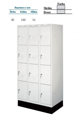 Priehradková kovová skrinka dvanásťdverová, ideálna na odkladanie osobných vecí, vyrobená z kombinácie oceľových plechov 0,8 mm skriňa a 0,7 mm dvere.
