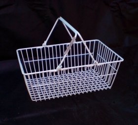 Biely - drôtený. Rozmery: dĺžka 48 cm, šírka 30 cm, výška 17 cm.