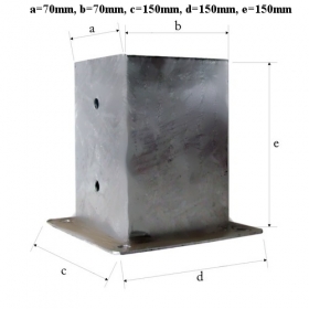 A=70mm, b=70mm, e=150mm, c=150mm, d=150mm, hrúbka plechu 2mm, diery 10mm. Povrchová antikorózna ochrana - žiarové zinkovanie.