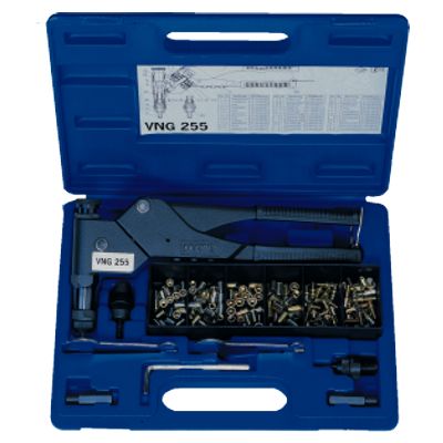 Kliešte na maticové a skrutkové nity, s otočnou nitovacou hlavou a základnou sadou nitov v kufríku.