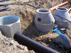 Pokládka kanalizačných vedení a šácht. Pre betonáž základov.