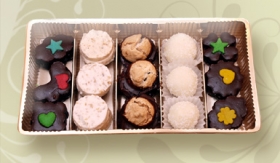 Koláčiky z kakaového lineckého cesta zdobené marcipánom, laskonky korpus orechový, plnené kokosky, kokosové guľôčky.
