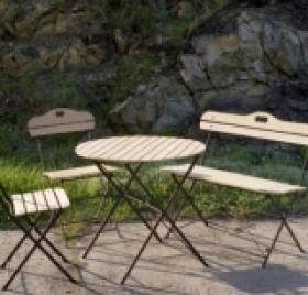 Sklápací záhradný nábytok je využiteľný na chate, chalupe, terase, balkóne a najmä v záhrade. Základný záhradný set sa skladá z 1 sklápacej lavičky, 1 sklápacieho stola a 2 sklápacích stoličiek. Rám je vyrobený z oceľovej konštrukcie, sedacia plocha a doska stola je zo smrekových latiek.