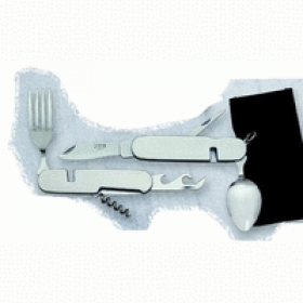 Zatvárcí nôž, kempingová súprava: lyžička, nôž, vydlička, otvárač na flaše, dierovač.