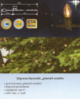 20 ks žiaroviek symbolizujúce plameň sviečky, objímka E14, masívny gumový kábel, pre vonkajšie a vnútorné použitie, typ náhradnej žiarovky: L20/K.