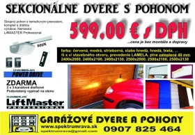 AKCIA je na sekcionálne dvere, plne zateplené hrúbka 40 mm, prevedenie lamelové, komplet so štandardným kovaním, kde je potrebný preklad 20-25 cm a ostenie min. 10 cm po oboch stranách s pohonom na diaľkové ovládanie, s 2 x diaľkovým, s podsvieteným vypínačom na stenu, remeňovým prevodom. Stavebný otvor pre danú AKCIU: 2400 x 2000, 2400 x 2100, 2400 x 2130, 2500 x 2000, 2500 x 2100, 2500 x 2130 mm, farebná úprava je možná: Biela RAL9016, hnedá RAL8017-8014, Strieborná RAL9006, modrá alebo červená. Pri iných prevedeniach, rozmeroch alebo imitácii dreva je nutné si dať vypracovať cenovú ponuku. Bližšie info na našej stráne: www.spektrumrava.sk, prípadne 0907 825 464.