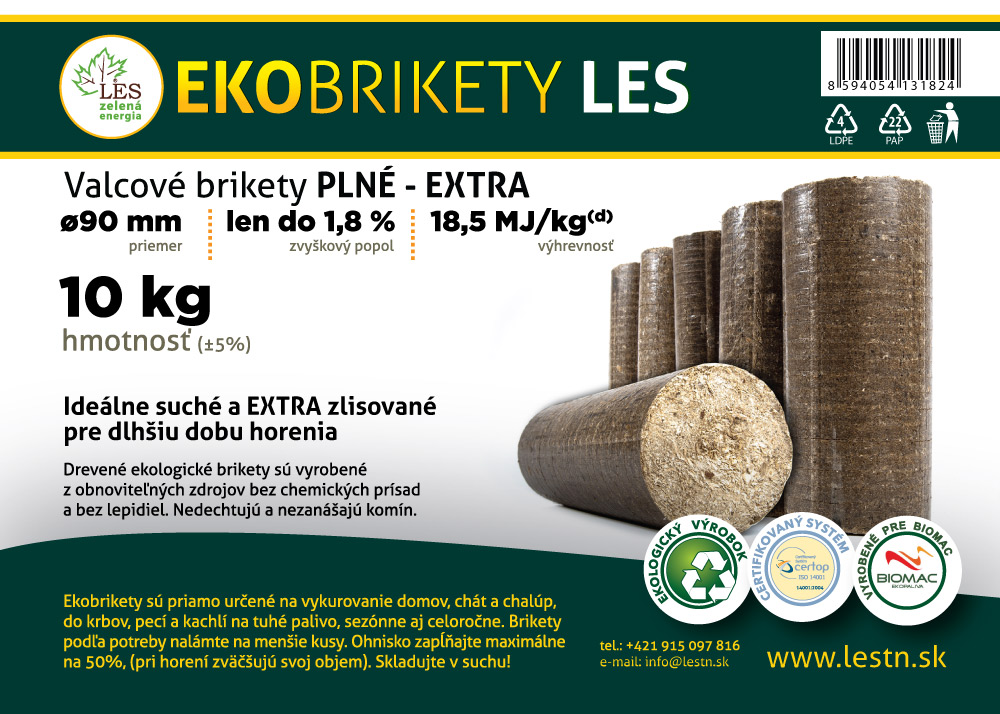 Spoločnosť LES, s.r.o. zelená energia sídli v Trenčíne a výrobnú prevádzku s veľkoskladom má areáli Poľnohospodárskeho družstva v Drietome. Už takmer 20 rokov vyrába vysokokvalitné valcové brikety z čistej domácej biomasy, tj. piliny, hobliny, štiepka a iná drevná surovina zo slovenskej drevárskej prvovýroby. DREVENÉ BRIKETY sa svojimi vlastnosťami najviac podobajú drevu, majú však väčšiu výhrevnosť. Horia jasným plameňom, takmer bez dymu, s vôňou ako drevo, z ktorého boli vyrobené. Sú vhodné do všetkých druhov kotlov, krbov a pecí na tuhé palivo. Veľmi nízke emisie, minerálny popol, CO2 neutrálny cyklus, sú dôležitými podmienkami pre zaradenie brikiet medzi EKOPALIVA pod označením EKOBRIKETY. Drevené EKOBRIKETY ktoré sa vyrábajú na Slovensku a v zahraničí, sú rôzneho tvaru a veľkosti v závislosti od použitého lisovacieho zariadenia a jeho kvality. Môžu byť s priemerom od 4 do 9 cm a dĺžkou od 4 do 25 cm, valcové alebo tehlové. Brikety s hmotnosťou cca 2 kg/ks sa vyznačujú vysokým zlisovaním a výrazne dlhšou dobou horenia. V minulosti sa pojmom brikety označovali uhoľné brikety menších rozmerov a rôznych tvarov. V posledných rokoch sa, do popredia dostávajú brikety vyrobené z drevnej suroviny (čisté piliny, hobliny, kusy dreva), teda z obnoviteľných zdrojov energie s nízkymi emisiami pri horení. Naše pravidelne aktualizované predajné ceny sú spravidla oveľa výhodnejšie, pretože nakupujete priamo u výrobcu.