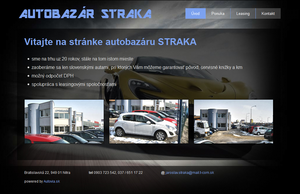 Naša firma sa zaoberá tvorbou web stránok už niekoľko rokov. Pripravíme Vám web stránku šitú na mieru od jej návrhu, cez vytvorenie kódu stránky - v prípade potreby spolu s redakčným systémom, až po jej nasadenie spolu s ponukou webhostingu a následnými službami, ako je sledovanie štatistík, optimalizácia pre vyhľadávače alebo aktualizovanie informácií. Dlhodobo spolupracujeme so spoločnosťou Autovia a vytvárame web stránky pre ich klientské autobazáry www.autostraka.sk, www.topautogroup.sk a ďalšie. Okrem toho medzi naše ostatné projekty patria stránky www.tyrapol.sk, www.nalezisko.sk, www.slovakfoodfestival.sk.