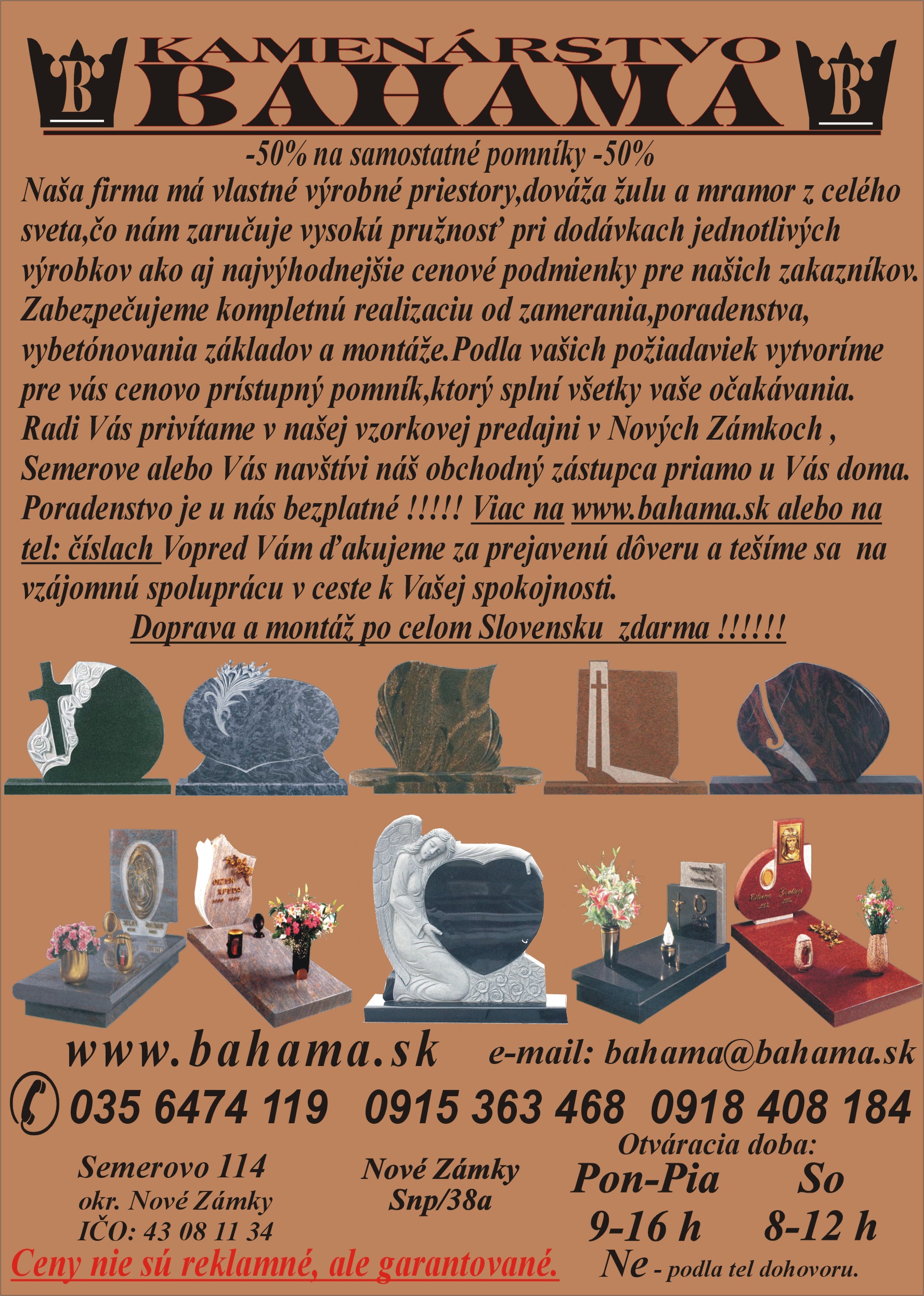 Žulový dvoj hrob od 1200 € - Ponuka Ročne máme vyše 300. 100%-ne spokojných zákazníkov, ktorý si vybrali našu prijateľnú cenu a vysokú KVALITU. Staňte sa aj Vy našim zákazníkom... Vopred Vám Ďakujeme za vašu dôveru... Vážený zákazníci Kamenárstvo BAHAMA, zatiaľ napriek svojej krátkej histórii zažilo už veľmi veľa úspechov u samotných spokojných zákazníkov. Naša firma sa snaží vykonávať 100%-ne kvalitnú prácu a pritom nezajsť do extrémnych cien... Každá naša cena bola vymeraná z minimálnou maržou, aby sa tým stala dostupnejšia pre širokú vrstvu Zákazníkov.V terajšej dobe si uvedomujeme, že na trhu s ponukami môže úspešne obstáť len firma s vysokou kvalitou za nízke ceny a práve toto sa stalo našim krédom... NAŠA PONUKA -Výroba a montáž samostatných pomníkových dielov ako sú, / Ohrady / krycie dosky / samostatné pomníky /základy / krypty / a všetky druhy pomníkových doplnkov... -Renováciu starších pomníkov, pozlátenie písma, prebrúsenie povrchu starých machom zanesených pomníkov ,rekonštrukciu, rozpadnutých pomníkov dosekávanie dátumov a pod... Každú našu prácu vykonávame z najlepšou dostupnou technológiou a z dlhodobou zárukou... V prípade že nás kontaktujete, radi Vám bezplatne poradíme a každú zákazku riešime individuálne, teda je možne sa s cenou aj dohodnúť.... Vopred Vám ďakujeme za prejavenú dôveru a tešíme sa na našu spoluprácu v ceste k Vašej spokojnosti.Doprava a montáž po celom Slovensku zadarmo !!!!! Mile radi Vás privítame našej vzorkovej predajne v Nových Zámkoch , Semerove alebo Vás navštívi náš obchodný zástupca priamo u Vás doma !!! Bezplatné poradenstvo !!!! Viac na www.bahama.sk alebo na tel. 0915363468 Meno: Stétz Telefón: 0915363468 E-mail: bahama@bahama.sk