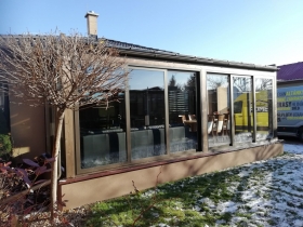 ZIMNÉ ZÁHRADY : konštrukcia drevené, lepené, sušené, hobľované hranoly BSH + bočný posúvny termoizolačný systém Cortizo.